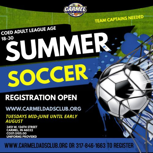 Please click here to register for this league. Registration is open now- June 12 Jerseys and socks are provided Questions please contact the office 317-846-1663 or email info@carmeldadsclub.org