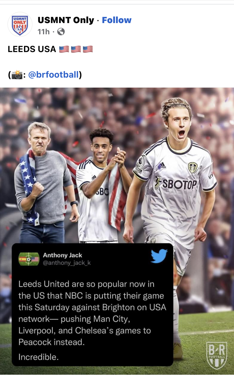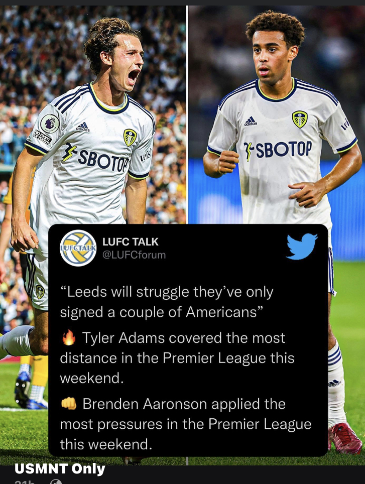 That thud and huge roar you heard on Sunday morning last week was Chelsea falling to the ground and Leeds United States of America stepping on their faces !! Yes if you actually play your American’s Tuchel – good things might just happen. Leeds didn’t just beat Chelsea with American youngster Brendan Aaronson scoring his first EPL goal in dramatic fashion. They slaughtered the former European Champions 3-0 at Elland Road (from the stands)– with fellow American Tyler Adams being named Player of the Match for his midfield performance as the ultimate #6 – shutting down Chelsea’s attack before it could get off the ground. At least 3 times he cut off fast break opportunities and was seemingly all over the field. Even the insertion of American Christian Pulisic in the 65th minute did nothing for the blues who have basically disintegrated now that Chelsea manager Tuchel is inserting his “own” players. Tuchel has made even the best attackers looks like bums with the 3rd worse offense in the EPL.. My favorite of the weekend might have been American coach Jesse Marsch reaction after Aaronson scored the first goal (its spelled Soccer you English bums!). Yes this American coach who has this former formidable club Leeds United back near the top of the table, can coach. And these American’s he signed – Brendan Aaronson, Tyler Adams and even Jack Harrison really (he’s English but played his formative years in MLS) CAN PLAY SOCCER. There is room on this bandwagon American Soccer fans – join us as the next 2 week’s games are on USA Network at 10 am on Saturday’s– a sign that Leeds United States of America is here!! Cool Story on Leads and Jesse MarschNice piece on Brendan Aaronson