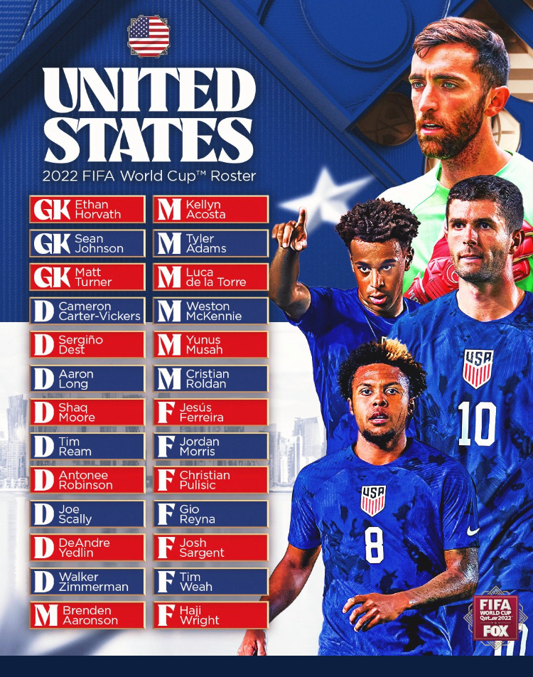 So the Roster has been named for the US World Cup team going to Qatar in just 11 days – Berhalter stayed true to his normal rotation but did have a few surprises. First and foremost is the omission of Zach Steffan – I feel bad for Zach that his injuries and poor form have come over the past year – but the 26 year old is simply not up to snuff right now in Europe and in my opinion should not be on this roster. I am relieved to think that baring injury Arsenal GK Matt Turner our BEST shotstopper will be between the pipes. I believe he’s got great games in him and will have to have a game changing performance along the way if the US is to advance to the Knockout Rounds. (love this snippet on Turner from ESPN). The other huge omissions were #9s Ricardo Pepi and Jordan Pfok for Haji Wright who is playing fantastically in Turkey and grew up playing with Pulisic, Adams & McKinney on US Youth National teams. (don’t discount that relationship he has had since childhood with the heart and soul of this young team). I am still not convinced he shouldn’t bring a 4th striker in Pfok but he hasn’t been as hot the last month in Germany as Wright and Josh Sargent have been in Europe. Thrilled to see Tim Ream in Defense he should start between Robinson on the left and Zimmerman on the right in my mind. He starts for Fulham who is 10th in the EPL and has faced many of the players for England and Wales. (He gets the nod in game 1). Also thrilled Joe Scally from M’Gladbach – he can play either wingback and should start if Dest is not ready to go on the right. I am a little disappointed to see Cristian Roldan/Jordan Morris rather than Paul Arriola. I know he’s MLS – but Paul bleeds Red /White and Blue and would have represented the US
