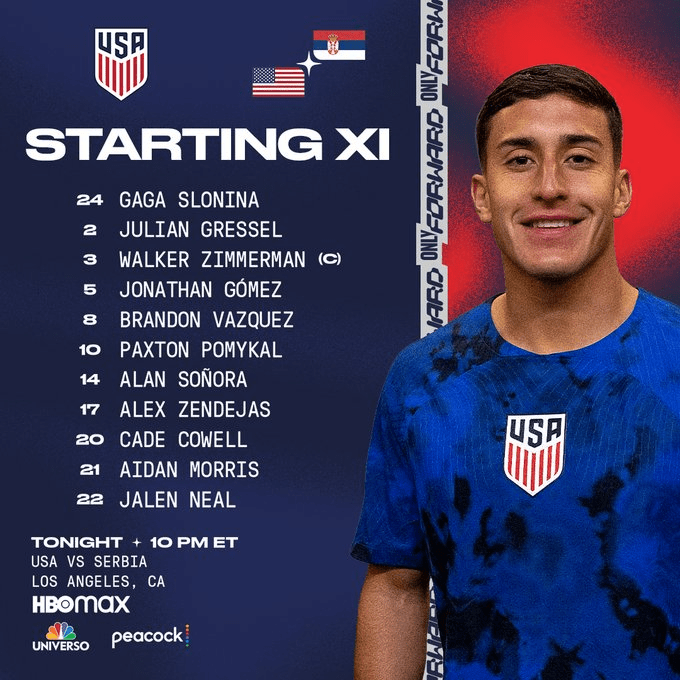 I thought the youngsters really looked good tonight. Brendon Vazquez was exquisite up top scoring the lone goal for the US, Zendejas showed why Mexico and the US are vying for his services as the Club America man had multiple opportunities up top. I thought Morris was very good at the dmid slot. Cade Cowell showed his pace and had fantastic delivery on the left wing (hitting the post twice). I thought Jones was incredibly dangerous at the right back slot when he came in providing a # of great runs and good crosses in. The US just couldn’t quite capitalize in the 2nd half but we certainly out possessed (63%), outshot (20-11) and completely dominated the 2nd half even if Serbia scored the lone 2nd half goal on stupid mistake by the 19 year Neal giving up the 2-1 loss. Great to see 18 year old GK Gaga Slonina start in the net – he made a couple of nice saves including this (What a Save by Gaga). Brandon Vasquez Cincy FC Man Scored the lone US Goal. I love that we started and played the youngsters tonight.