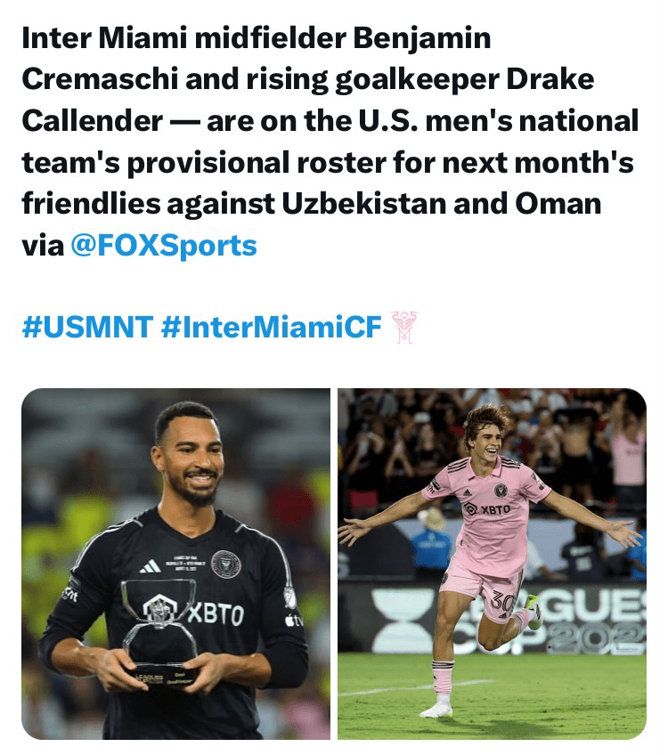 But the roster also includes significant dual national news is that Inter Miami’s Benja Cremaschi has been selected as he has emerged as one of the most impressive teenagers in MLS and is also a dual national with options. Last winter, he was playing with Argentina’s U-20 team and lately has stood out playing alongside Lionel Messi. In recent interviews (including to ASN in March), he has said that he is in contact with both federations.