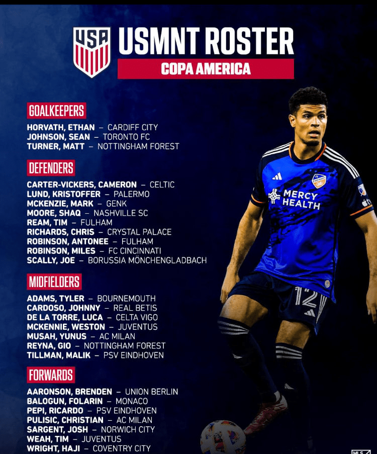 MIDFIELDERS (7): Tyler Adams (Bournemouth), Johnny Cardoso (Real Betis), Luca de la Torre (Celta Vigo), Weston McKennie (Juventus), Yunus Musah (AC Milan), Gio Reyna (Nottingham Forest), Malik Tillman (PSV Eindhoven)