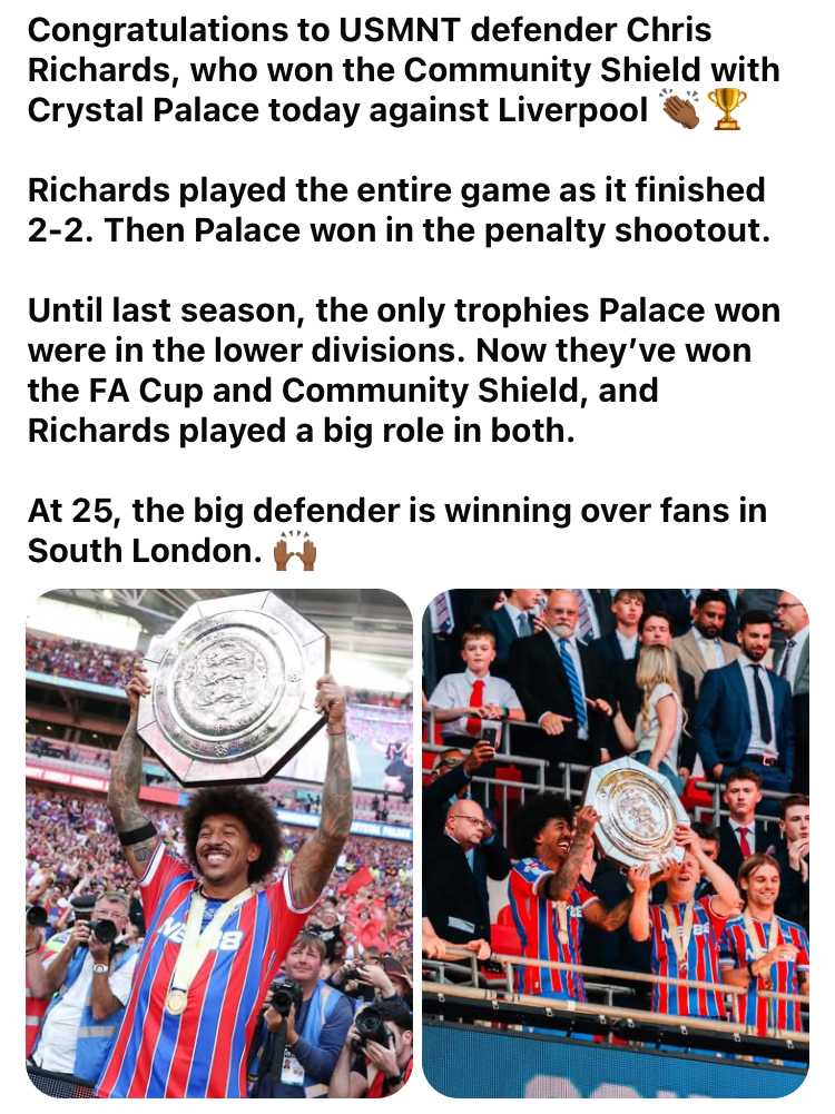 Aston Villa v Crystal Palace – 2p on USA Network: Chris Richards and Crystal Palace have opened their Premier League season with a pair of draws against Chelsea and Nottingham Forest with Richards playing the full 90’ in both matches. Richards also went 90 on Thursday as Palace played Norwegian side Fredrikstad FK to a scoreless draw in see out their 1-0 aggregate win in UEFA Conference League qualifiers. Palace have allowed just four goals across five matches in all competitions to start the season, including two in their win over Liverpool in the Community Shield match, and Richards is a key figure in what appears to be a solid defense. Palace will face an Aston Villa side this weekend that are looking for their first win, and first goal of the season.