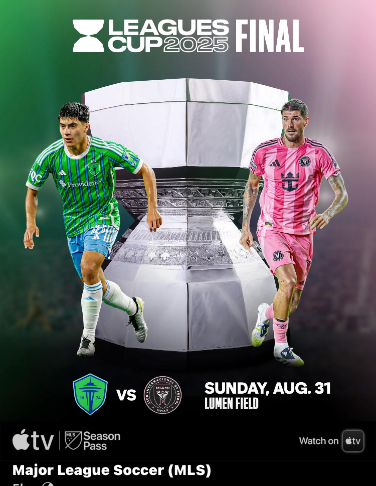 8 pm Apple, Univision Seattle Sounders vs Inter Miami Leagues Cup Final