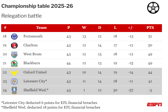 One side who won’t be involved in the drama though are Sheffield Wednesday. The Owls sit rock bottom in 24th, and are already relegated, miles away from ever leaving the foot of the table after having 18 points deducted this season for financial breaches linked to previous owner Dejphon Chansiri. They remain in administration and in the process of finding a buyer and defeat against bitter rivals Sheffield United on Feb. 22 saw them relegated in record time. They did manage to take a point from champions-elect Coventry though, a result that delighted their ever-enthusiastic travelling supporters.