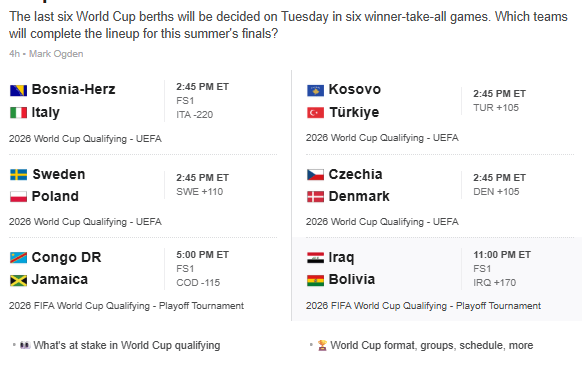 WORLD CUP QUALIFYING the Last 6 Teams Will Be Decided Tuesday