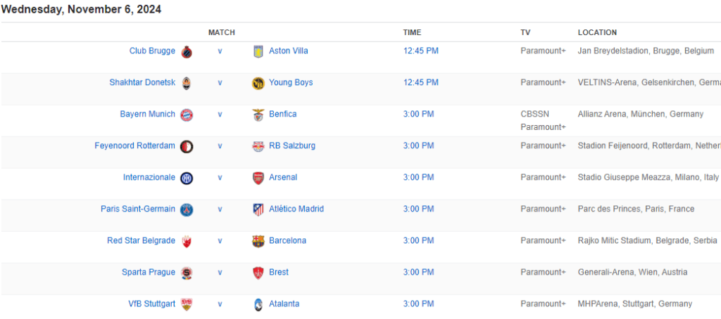 Thurs, 11/27 Europa 12:45 pm Feynord vs Celtic (Trusty) Fri, Nov 28 2:30 pm B MGladbach (Reyna, Scally) vs RB Leipzig 7 pm TNT, Max USWNT vs Italy Sat, Nov 29 9:30 am ESPN+ Union Berlin vs Heidneheim 10 am USA Brentford vs Burnley (Adams) 12 noon Para+ Juventus (McKinney) vs Calgari 12:30 pm ESPN+ Bayer Leverkusen (Tilman) vs Dortmund 2:45 pm Para+ AC Milan (Pulisic) vs Lazio 3 pm USA Tottenham vs Fulham 6 pm Apple TV Inter Miami (Messi) vs NYCFC MLS East Conf Finals 9 pm Apple TV San Diego, Vancouver MLS West Conf Finals 10 pm Telemundo Tigres vs Tijuana Sun, Nov 30 7 am USA Crystal Palace (Richards) vs Man United 9 am Para+ Pisa vs Inter Milan 9 am USA Aston Villa vs Wolverhampton 9 am PEacock Nottingham Forest vs Brighton 9 am Pea West Ham vs Liverpool 11:30 am USA Chelsea vs Arsenal 3 pm ABC Girona vs Real Madrid Mon, Dec 1st 7 pm TBS, Max USWNT vs Italy